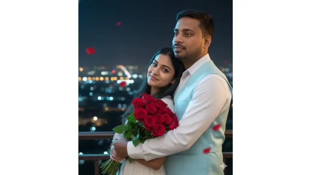 Generate a romantic Rose Day edit: young Indian couple on a balcony overlooking city lights at night, boyfriend embracing girlfriend from side while she holds a bouquet of red roses, both with peaceful smiles, keep every facial detail, skin texture, outfits, and embrace pose identical to the original photo, add twinkling city bokeh, soft moonlight + warm balcony lamp glow, artistic falling petals, vertical 3:4 aspect ratio, ultra-detailed emotional connection