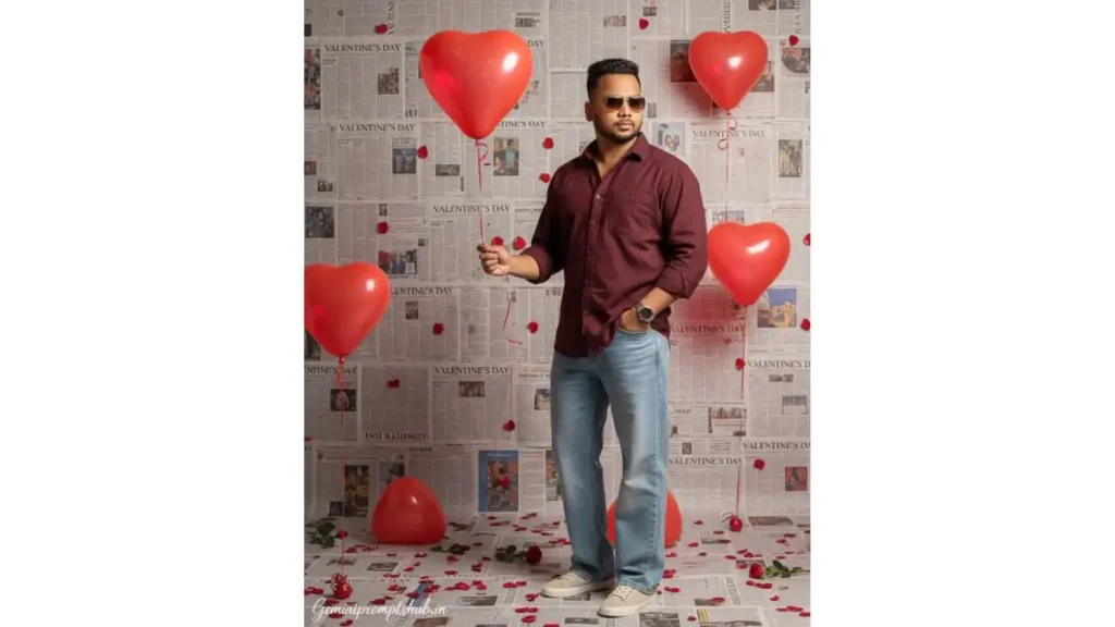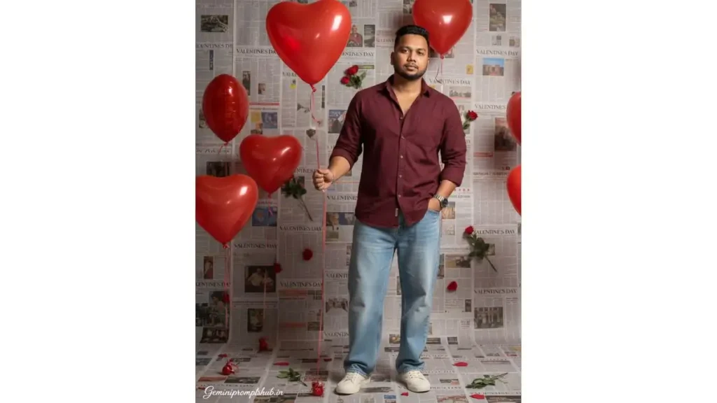 IMPORTANT – FACE LOCK (NON-NEGOTIABLE) Keep the subject’s real face exactly the same as the reference image. Do NOT change facial structure, jawline, eyes shape, nose, lips, beard, hairline, skin tone, age, or expression. No beautification, no AI facial modification, no smoothing. Preserve real human skin texture, pores, slight imperfections. The person must be instantly recognizable as the same individual. SCENE TYPE Ultra-realistic real-life fashion photography in a Valentine’s Day themed indoor studio. Looks exactly like a professional DSLR photoshoot, not AI generated. OUTFIT DETAILS Dark wine / maroon cotton casual shirt Top buttons slightly open Full sleeves, relaxed premium fit Light blue loose wide-leg denim jeans Off-white casual sneakers with realistic texture Silver wristwatch on left wrist only No extra jewelry POSE DETAILS (POSE 1 – STILL CONFIDENCE) Standing straight with relaxed posture One hand holding a red heart-shaped helium balloon string at waist level Other hand inside jeans pocket Body facing camera, head slightly tilted to one side Chest relaxed, shoulders natural EXPRESSION & MOOD Calm, confident, mature expression No smile Strong Valentine editorial vibe Eyes sharp and focused Stylish, composed attitude BACKGROUND & SET DESIGN Studio wall and floor fully covered with layered newspaper pages Clear readable newspaper headline: “VALENTINE’S DAY” Multiple red heart-shaped balloons floating at different heights Fresh red roses placed on floor and lightly attached to wall Romantic but modern studio atmosphere LIGHTING Soft studio lighting from front Balanced highlights on face Natural shadow falloff No cinematic color grading No artificial glow CAMERA & QUALITY Mid-length portrait Eye-level camera angle Everything in sharp focus Zero blur, zero bokeh Ultra-HD, photorealistic clarity TEXT / SIGNATURE Add “Geminipromptshub.in” at the bottom-left corner, handwritten signature-style typography, thin cursive strokes, small size, subtle premium elegance, white or soft off-white color. ASPECT RATIO 3:4 vertical