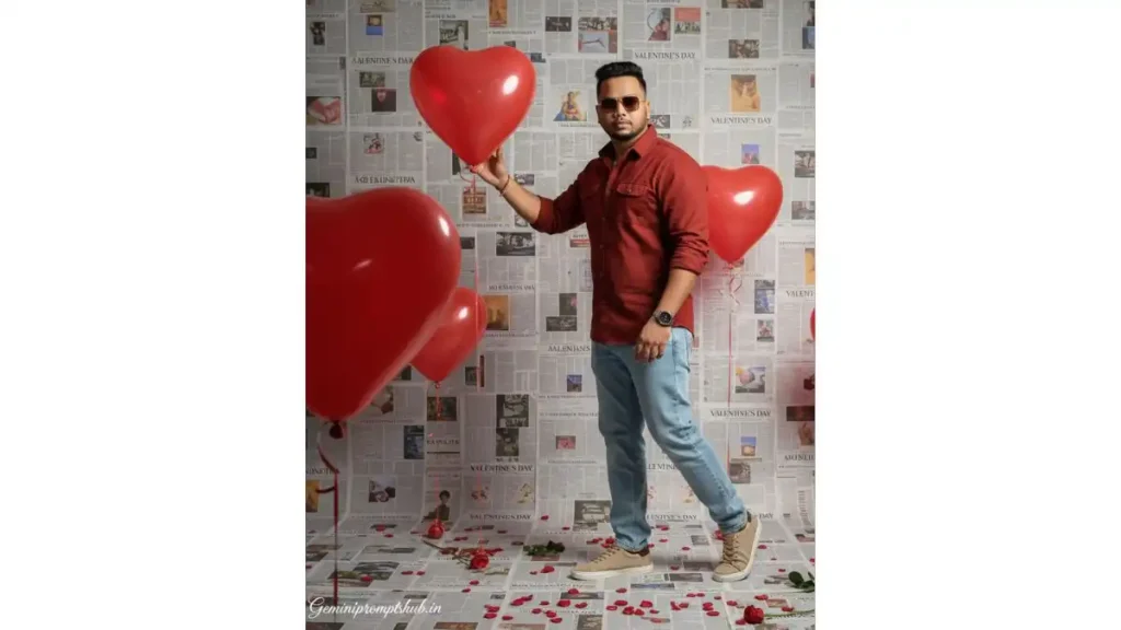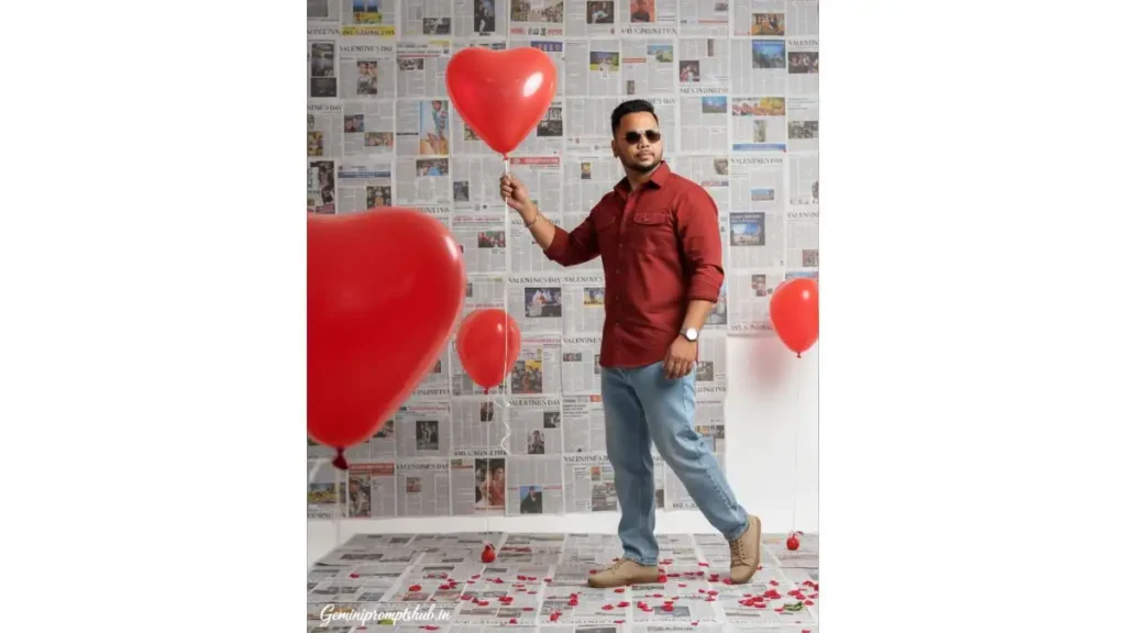 FACE LOCK – IMPORTANT (NON-NEGOTIABLE) Keep the subject’s real face exactly the same as the uploaded reference image. Do NOT change facial structure, jawline, eyes, nose, lips, skin tone, beard, hairline, age, or expression. Preserve real human skin texture, pores, natural imperfections. No beauty filter, no AI facial modification, no cartoon or anime look. SCENE TYPE: Ultra-realistic real-life fashion photography in a Valentine’s Day-themed indoor studio. Must look like a genuine professional DSLR photoshoot, not AI-generated. OUTFIT DETAILS: Dark maroon casual cotton shirt Top two buttons open Full sleeves, slightly relaxed fit Light blue wide-leg jeans Off-white casual sneakers Silver wristwatch on left wrist only POSE DETAILS (POSE A – SIDE CONFIDENCE): Standing at a slight angle (3/4 body turn) One hand holding a red heart balloon string loosely Other hand resting inside jeans pocket Head turned slightly away from camera Chest forward, confident stance EXPRESSION & MOOD: Calm, confident, mysterious No smile Strong fashion-model attitude Eyes partially visible behind sunglasses BACKGROUND & SET DESIGN: Studio walls and floor fully covered with layered newspaper pages Clear readable headline on newspaper: “VALENTINE’S DAY” Red heart-shaped balloons floating at different heights Fresh red roses scattered on floor and lightly attached to wall Clean, romantic but stylish editorial vibe LIGHTING: Soft studio light from front Even illumination on face Natural shadow falloff No dramatic or cinematic grading CAMERA & QUALITY: Mid-length portrait Eye-level camera Everything sharp Zero blur, zero bokeh Ultra-HD, photorealistic TEXT / SIGNATURE: Add “Geminiaiprompt.in” at the bottom-left corner, handwritten signature-style typography, thin cursive strokes, small size, subtle premium elegance, white or soft off-white color. ASPECT RATIO: 3:4 vertical